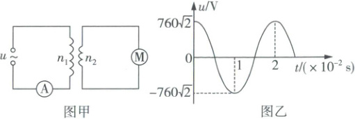 10.BD 理想变压器的工作原理+功率+功能关系 [2025 课标新变化:在学业质量水平1中新增“能为我国在科技领域的卓越成就感到自豪,具有科技强国和实现中华民族伟大复兴的责任感"] 根据题图乙可得原线圈两端电压有效值为$U_{1}=\frac{U_{m}}{\sqrt{2}} = 760V$,电动机额定电压为$380V$,可知副线圈两端电压有效值为$U_{2}=380V$,根据理想变压器的变压规律得理想变压器的原、副线圈匝数比$\frac{n_{1}}{n_{2}}=\frac{U_{1}}{U_{2}}=\frac{760V}{380V}=2$,A错误;电流表示数为有效值,则原线圈中电流有效值$I_{1}=12.5A$,根据理想变压器的变流规律$\frac{I_{1}}{I_{2}}=\frac{n_{2}}{n_{1}}$可知,副线圈电流有效值$I_{2}=\frac{n_{1}}{n_{2}}I_{1}=25A$,则电动机内阻上的发热功率为$P_{热}=I_{2}^{2}r = 625W$,B正确;电动机的输出功率为$P_{出}=I_{2}U_{2}-P_{热}=8875 - 625W = 8250W$,C错误;$1s$内,电动机的输出能量为$W = P_{出}t = 8875J$,由功能关系得$W = mgh$,代入$m = 88.75kg$,可解得$h = 10m$,即电动机$1s$内可将$88.75kg$水抽到$10m$高处,D正确。