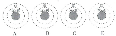 综上可知,蓝光在最小虚线圆分界线处发生全反射,红光在最大虚线圆分界线处发生全反射,则最外侧相邻两条分界线间区域内只有红光,最内侧相邻两条分界线间区域为红光和黄光,A对,BCD错。
