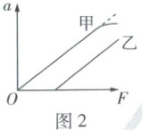 5. ☆图1是“探究小车加速度与所受合外力的关系”的实验装置图。甲、乙两名同学用该装置得到加速度$a$与拉力$F$的关系如图2所示。下列分析正确的是