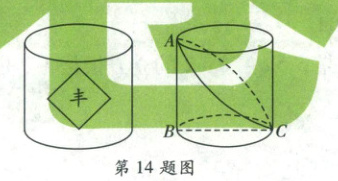 14. 右侧扫码·视频讲解 小彬用3D打印机制作了一个底面周长为30 cm,高为20 cm的圆柱粮仓模型,如图,$BC$是底面圆直径,$AB$是高,现要在此模型的侧面贴一圈彩色装饰带,使装饰带经过$A,C$两点(接头不计),则装饰带的长度最短为