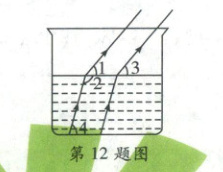 12. 光线在不同介质中的传播速度是不同的,因此光线从水中射向空气时,要发生折射。由于折射率相同,所以在水中平行的光线,在空气中也是平行的。如图,若平行光线由水中射向空气时所形成的$\angle 1 = 50°$,$\angle 4 = 75°$,则$\angle 2 + \angle 3 =$