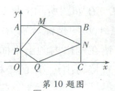 10. 右侧扫码·视频讲解 如图,在平面直角坐标系中,长方形$OABC$在第一象限,$OC,OA$分别在$x$轴和$y$轴上,$P,Q$分别为$OA,OC$上一点,点$M$在$AB$上,$AM = 2$,$N$为$BC$的中点,若点$B$的坐标是$(6,4)$,则四边形$PQNM$的周长最小值为(