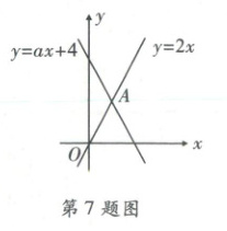 7. 如图,一次函数$y = 2x$和$y = ax + 4$的图象相交于点$A(m,2)$,则关于$x,y$的方程组$\begin{cases}y = 2x,\\y = ax + 4\end{cases}$的解为( )。