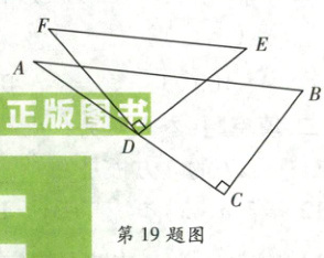 19. (6 分)如图所示,$\triangle ABC$与$\triangle DEF$均为直角三角形,其中$\angle C = \angle FDE = 90°$,$\angle E = 45°$,$\angle B = 60°$,点$D$在边$AC$上,$\angle ADF = 15°$,请判断两条斜边$EF$与$AB$的位置关系并证明。