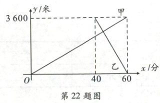 22. 右侧扫码·视频讲解 (7 分)已知$A,B$两地相距$3600$米,甲从$A$地出发步行到$B$地,$40$分钟后乙从$B$地出发骑自行车到$A$地,设甲步行的时间为$x$分钟,甲、乙两人离$A$地的距离分别为$y_1$米、$y_2$米,$y_1,y_2$与$x$的函数关系图象如图所示,根据图象解答下列问题: