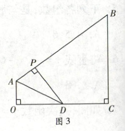 (3) 如图 3,四边形$OABC$是工厂张师傅设计的某零件平面示意图的一部分,$P,D$分别是$AB,OC$上两点,且$\angle AOD = \angle APD = \angle OCB = 90°$,$OA = AP = 2\ \mathrm{dm}$,$OC = BC = 8\ \mathrm{dm}$,现准备在$BC$边上再确定一点$Q$,画出一条分割线$PQ$,使得$S_{\triangle BPQ} = \frac{3}{5}S_{ 四边形ABCD}$,若存在点$Q$,请求出$BQ$的长度,若不存在,请说明理由。