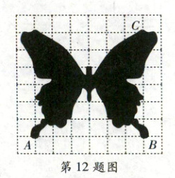 12. 如图,是一只蝴蝶标本,已知表示蝴蝶两“翅膀尾部”$A,B$两点的坐标分别为$(-3,-1)$,$(3,-1)$,则表示蝴蝶“翅膀顶端”点$C$的坐标为$\boldsymbol{$