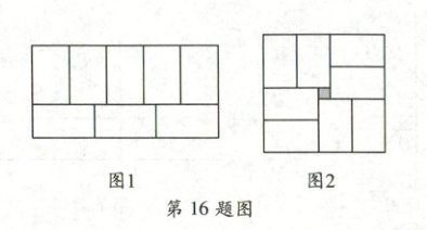 16. 右侧扫码·视频讲解 小明在拼图时,发现$8$个一样大小的长方形,恰好可以拼成一个大的长方形如图1;小红看见了,说:“我也来试一试。”结果小红七拼八凑,拼成了如图2那样的正方形,中间还留下了一个洞,恰好是面积为$25\ \mathrm{mm}^2$的小正方形,则每个小长方形的面积为$\boldsymbol{$
