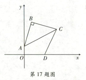 17. 右侧扫码·视频讲解 如图,在平面直角坐标系中,点$B(1,5)$,点$D(3,0)$,$A$为$y$轴上一点,连接$AB$,将$AB$绕点$B$逆时针旋转得$BC$,连接$AC$,得到等腰直角$\triangle ABC$,且$\angle ABC$为直角,连接$CD$,请写出当$|CB - CD|$最大时点$C$的坐标为$\boldsymbol{$