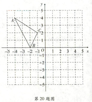 20. (7分)如图,在平面直角坐标系$xOy$中,点$A$的坐标为$(-4,4)$,点$B$的坐标为$(-2,0)$,点$C$的坐标为$(-1,2)$。