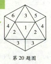 20. (7分)如图,有一枚均匀的正二十面体形状的骰子,其中的1个面标有“1”,2个面标有“2”,3个面标有“3”,4个面标有“4”,5个面标有“5”,其余的面标有“6”。小明和小颖拿这枚骰子玩游戏。