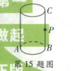 15. 右侧扫码·视频讲解 如图,有一个圆柱,底面圆的直径$AB = \frac {16}{\pi}$,高$BC = 12$,$P$为$BC$的中点,一只蚂蚁从$A$点出发沿着圆柱的表面爬到$P$点的最短距离为