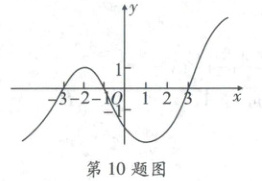 10. 右侧扫码·视频讲解 如图,关于$x$的函数$y$的图象与$x$轴有且仅有三个交点,分别是$(-3,0)$,$(-1,0)$,$(3,0)$,对此,小华认为:①当$y > 0$时,$-3 < x < -1$;②当$x > -3$时,$y$有最小值;③点$P(m,-m - 1)$在函数$y$的图象上,符合要求的点$P$只有1个;④将函数$y$的图象向右平移1个或3个单位长度经过原点。其中正确的结论有(