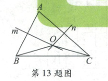 13. 如图,在$\triangle ABC$中,$AB$,$AC$的垂直平分线$m$,$n$相交于点$O$,若$\angle BAC = 72°$,则$\angle OBC$的度数为