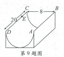 9. 右侧扫码·视频讲解 如图,这是一个供滑板爱好者使用的 U 型池的示意图,该 U 型池可以看作是长方体去掉一个“半圆柱”而成,中间可供滑行部分的截面是直径为$8\ m$的半圆,其边缘$AB = CD = 20\ m$,点$E$在$CD$上,$CE = 5\ m$,一名滑板爱好者从$A$点滑到$E$点,则他滑行的最短距离为(