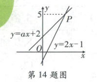 14. 如图,一次函数$y = ax + 2$与$y = 2x - 1$的图象相交于点$P$,则关于$x$的方程$ax + 2 = 2x - 1$的解是