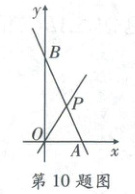 10. 右侧扫码·视频讲解 如图,一次函数$y = -3x + m$的图象与$x$轴、$y$轴的交点分别为$A$,$B$,直线$y = kx$与直线$AB$在第一象限的交点为$P$,若$\triangle BOP$与$\triangle AOP$的面积比为$\sqrt{3}$,则$k$的值为(