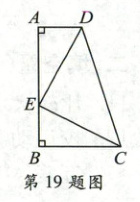19. (6 分)如图,在四边形$ABCD$中,$\angle A = \angle B = 90°$,$E$是$AB$边上的一点,$AE = BC$,连接$DE$,$EC$,且$DE = EC$。求证:$DE \perp EC$。