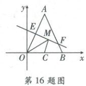 16. 右侧扫码·视频讲解 如图,在平面直角坐标系中,等腰三角形$OAB$的底边在x轴上,$B(6,0)$,面积是15,腰$AO$的垂直平分线$EF$分别交$AO$,$AB$边于E,F点。若C为$OB$边的中点,M为线段$EF$上的动点,则$\triangle COM$周长的最小值是