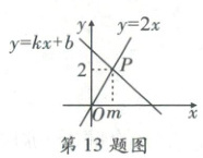 13. 如图,直线$y = 2x$与$y = kx + b$相交于点$P(m,2)$,则关于$x$的方程$kx + b = 2$的解是