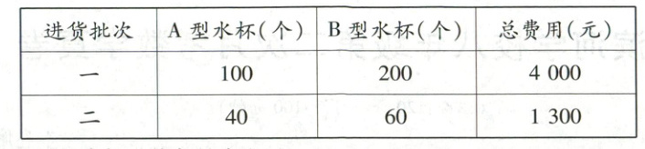 (1)设A种型号的水杯进价为x元,B种型号的水杯进价为y元,根据题意得$\begin{cases}100x + 200y = 4000\\40x + 60y = 1300\end{cases}$,