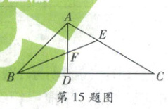 15. 如图,在$ \triangle ABC $中,$ \angle ABC = 45° $,$ AD \perp BC $,$ BE $平分$ \angle ABC $,分别交$ AC $,$ AD $于点$ E $,$ F $。若$ DF = \sqrt{2} $,$ AC = 4 + 2\sqrt{2} $,则$ \angle AEB $的度数为