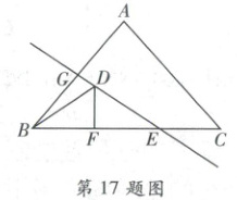 17. 右侧扫码·视频讲解 如图,等腰$ \triangle ABC $的面积为 189,底边$ BC = 18 $,点$ F $在边$ BC $上,且$ CF = 2BF $,$ EG $是腰$ AB $的垂直平分线,若点$ D $在$ EG $上运动,则$ \triangle BDF $周长的最小值为