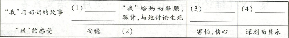 7. 请根据文章内容梳理“我”与奶奶之间的故事以及“我”的感受,完成表格。(8分)