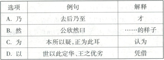 )14. 学习古文要注意积累。下面是一位同学对“乃”“然”“为”“以”的整理,其中解释有误的一项是(