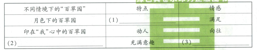 (2)根据“充满意趣”可定位至第⑨段,根据“我一边听着老师领读,脑子里却展开另一幅图画……我从来没有想到过这些生活如此富于意趣”可概括:想象(脑海、南坡生活)中的百草园。