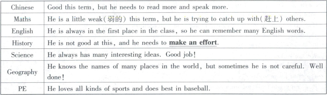 56. A 【解析】词义猜测题。根据“History”一行中的“He is not good at this, and he needs to make an effort”可知,他不擅长历史,他需要努力。A 选项 try very hard 意为:非常努力,符合题意,故选 A。