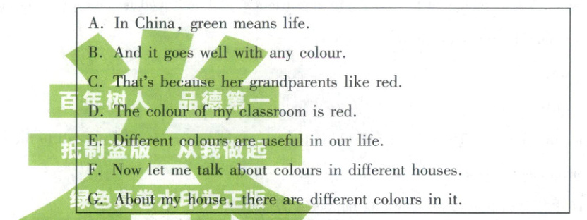 60. G 【解析】逻辑推理题。根据“These things make my house colourful and beautiful.”可知,此处介绍我家里的颜色。选项G符合语境。故选G。