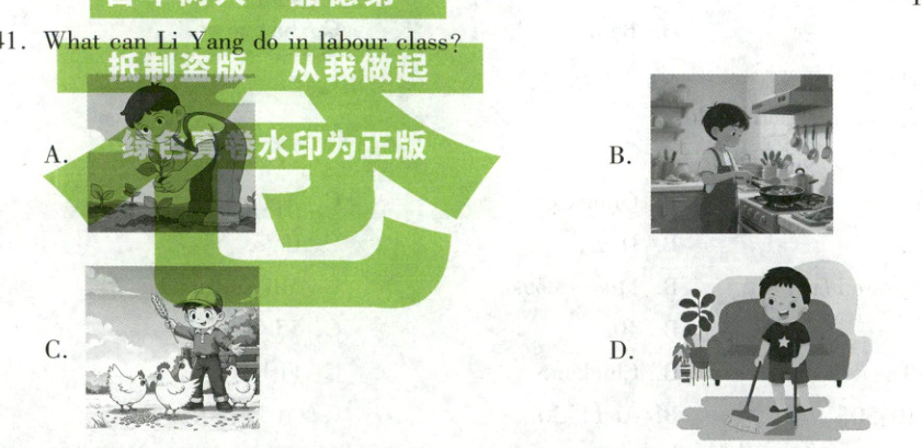 41. A【解析】图片理解题。根据“In our school, students have a labour class on Friday. We learn to grow vegetables.”可知,在学校,Li Yang在劳动课上种植蔬菜,图A符合题意。故选A。