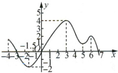 观察函数图象可以知道,图象上位置最高的点是(3,4),最低的点是(-1.5,-2),所以当x=3时,函数y=f(x)取得最大值,即$y_{max}=4;$当x=-1.5时,函数y=f(x)取得最小值,即$y_{min}=-2.$函数的增区间为[-1.5,3],[5,6];减区间为[-4,-1.5],[3,5],[6,7].