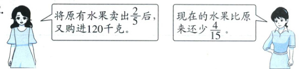将原有水果卖出$\frac{2}{5}$后,又购进120千克。现在的水果比原来还少$\frac{4}{15}$。原有水果多少千克?(5分)