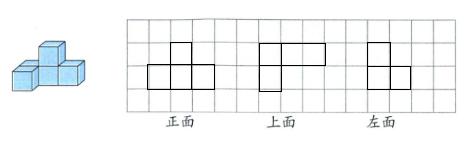 2.在方格中画出立体图形从正面、上面、左面看到的形状。(5分)
