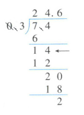 1. 豆豆的妈妈要将7.4 kg的香油分装在一些玻璃瓶里,每0.3 kg刚好可以装满一瓶,至少需要准备几个玻璃瓶才能把这些香油装完?根据右图的计算过程,箭头所指的“14”表示(