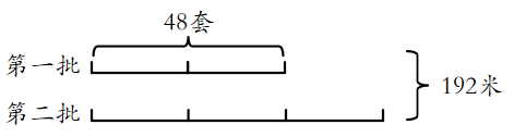 1. 其乐童装厂做童装,第一批做了 48 套,第二批做的套数是第一批的 1.5 倍,两批童装一共用去 192 米布,平均每套童装用布多少米?(先画线段图表示题意,再列式计算)(5 分)