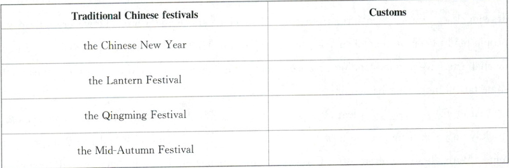 1. Discuss the following traditional Chinese festivals and their customs, complete the table.