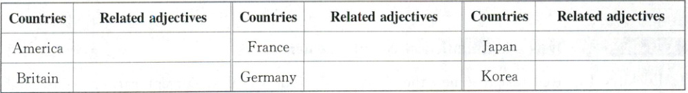 America→American Britain→British France→French Germany→German Japan→Japanese Korea→Korean