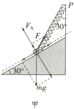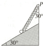 1. 如图所示,质量为$m$的小球置于倾角为$30°$的光滑斜面上,劲度系数为$k$的轻质弹簧,一端系在小球上,另一端固定在墙上的$P$点,小球静止时,弹簧与竖直方向的夹角为$30°$,则弹簧的伸长量为 (