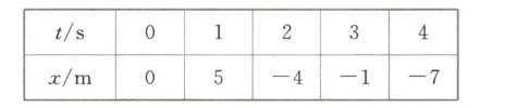 5.B [从题给表格中的数据可知,0时刻的位置是$x_{0}=0,$第2秒末的位置是$x_{2}=-4m,$故前2秒的位移为$\Delta x=-4m,$故A错误;第2秒末的位置是$x_{2}=-4m,$第3秒末的位置是$x_{3}=-1m,$故第3秒的位移为$\Delta x'=3m,$故B正确;第1秒末的位置是$x_{1}=5m,$第2秒末的位置是$x_{2}=-4m,$故第2秒内的位移为$\Delta x''=-9m,$第2s的平均速度为$\overline{v_{2}}=\frac{\Delta x''}{t_{2}}=\frac{-9}{1}m/s=-9m/s,$故C错误;路程为运动轨迹的长度,可知前2s内的路程至少为14m,所以前2s的平均速率至少为$v=\frac{s}{t}=\frac{14}{2}m/s=7m/s,$故D错误。]