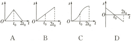 4. 如图所示,在一对称、光滑的斜面 AOB 的 A 处无初速度释放一个光滑小球,小球能够滑到等高的 B 处。小球的路程 s(从 t = 0 开始)随时间 t 变化的图线可能是图中的( )