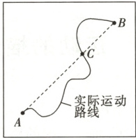7. 如图所示,某赛车手在一次野外训练中,先用地图计算出发地 A 和目的地 B 的直线距离为 9 km,实际从 A 运动到 B 用时 5 min,赛车上的里程表指示的里程数增加了 15 km,当他经过某路标 C 时,车内速度计指示的示数为 150 km/h,那么可以确定的是(