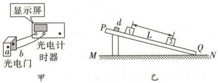 10. 光电计时器是一种研究物体运动情况的常用计时仪器,其结构如图甲所示,a、b 分别是光电门的激光发射和接收装置,当有物体从 a、b 间通过时,光电计时器就可以显示物体的挡光时间。图乙中 MN 是水平桌面,Q 是木板与桌面的接触点,1 和 2 是固定在木板上适当位置的两个光电门,与之连接的两个光电计时器没有画出。让滑块从木板的顶端滑下,光电门 1、2 各自连接的计时器显示的挡光时间分别为 2.5×10⁻² s 和 1.0×10⁻² s,小滑块的宽度 d 为 0.5 cm,则可测出滑块通过光电门 1 的速度 v₁ =
