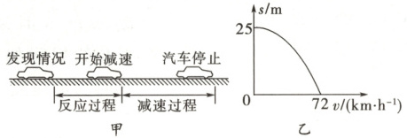 13. (16分)研究表明,一般人的刹车反应时间(图甲中“反应过程”所用时间)$t_0=0. 4 s$,但饮酒会导致反应时间延长。在某次试验中,志愿者少量饮酒后驾车以$v_0=72 km/h$的速度在试验场的水平路面上匀速行驶,从发现情况到汽车停止,行驶距离$L=39 m$。减速过程中汽车位移$s$与速度$v$的关系曲线如图乙所示,此过程可视为匀变速直线运动。求: