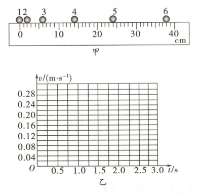 4. 一小球在桌面上从静止开始做加速直线运动,现用高速摄影机在同一底片上多次曝光,记录下小球每次曝光的位置,并将小球的位置编号。如图甲所示,$1$位置恰为小球刚开始运动的瞬间,作为零时刻。摄影机连续两次曝光的时间间隔均相同,小球从$1$位置到$6$位置的运动过程中经过各位置的速度分别为$v_1 = 0$,$v_2 = 0.06\ m/s$,$v_3 = \boldsymbol{$