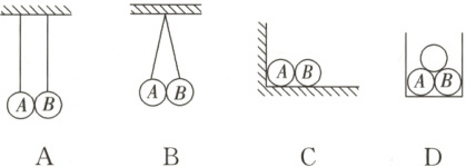B [在A中,若拿去A球,则B球静止不动,故A、B间没有挤压,即A、B间没有弹力。在B中,若拿去A球,则B球将向左运动,故A、B间存在相互挤压,即A、B间存在弹力。在C中,若拿去A球,则B球静止不动,故A、B间没有挤压,即A、B间没有弹力。在D中,不能判断A、B间有没有弹力。故应选B。]