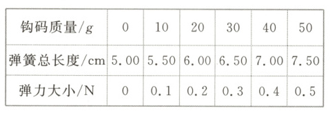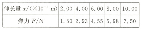 解析:横轴表示伸长量$x$,纵轴表示弹力$F$,按照表格数据,描点画图,得到一条直线,图像斜率代表弹簧劲度系数。