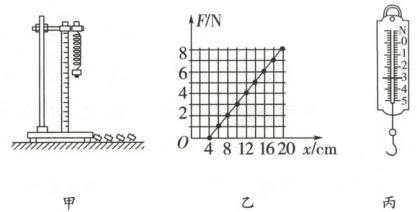 $ N/m $。(2) 他又利用本实验原理把该弹簧做成一把弹簧测力计,当弹簧测力计上的示数如图丙所示时,该弹簧的长度$ x = $